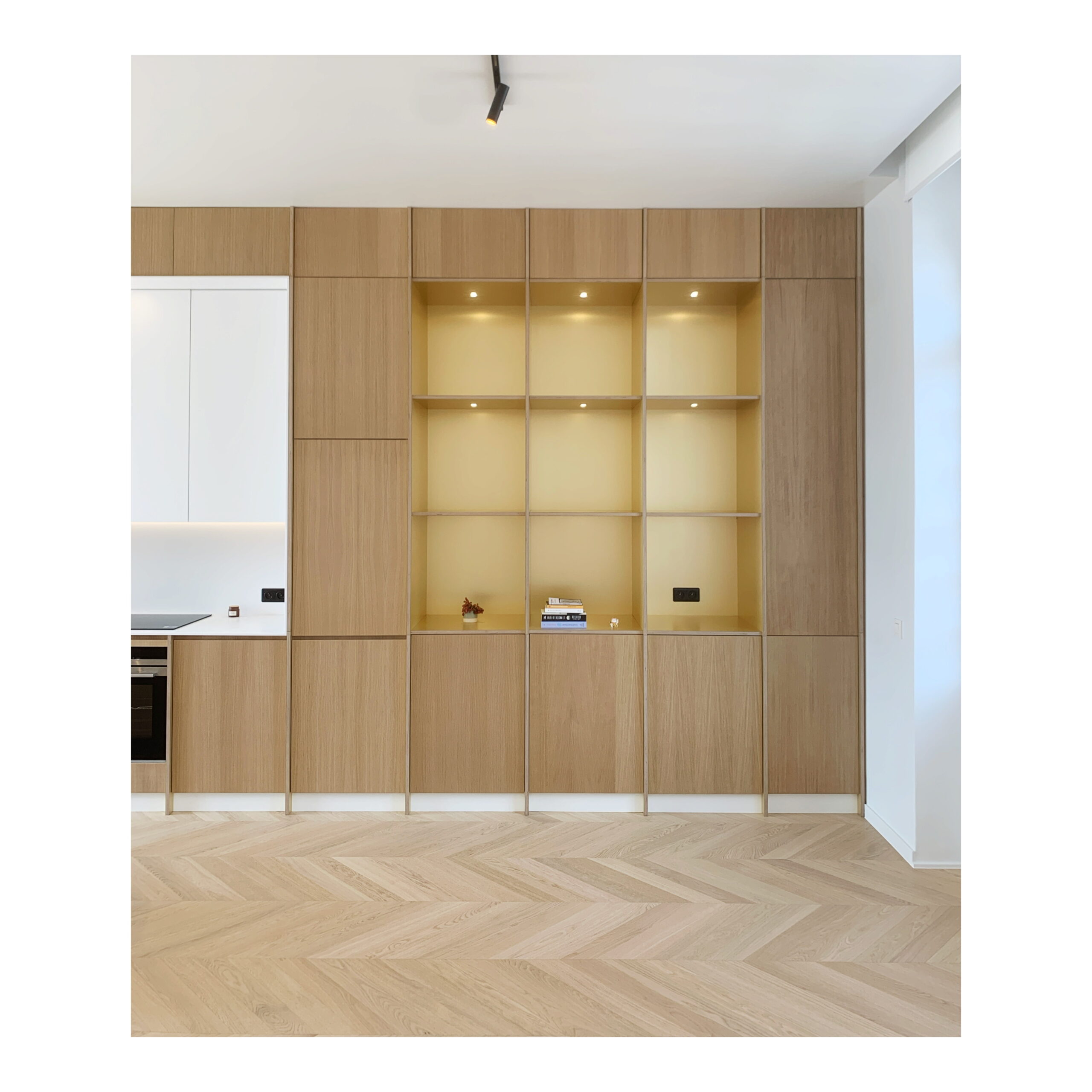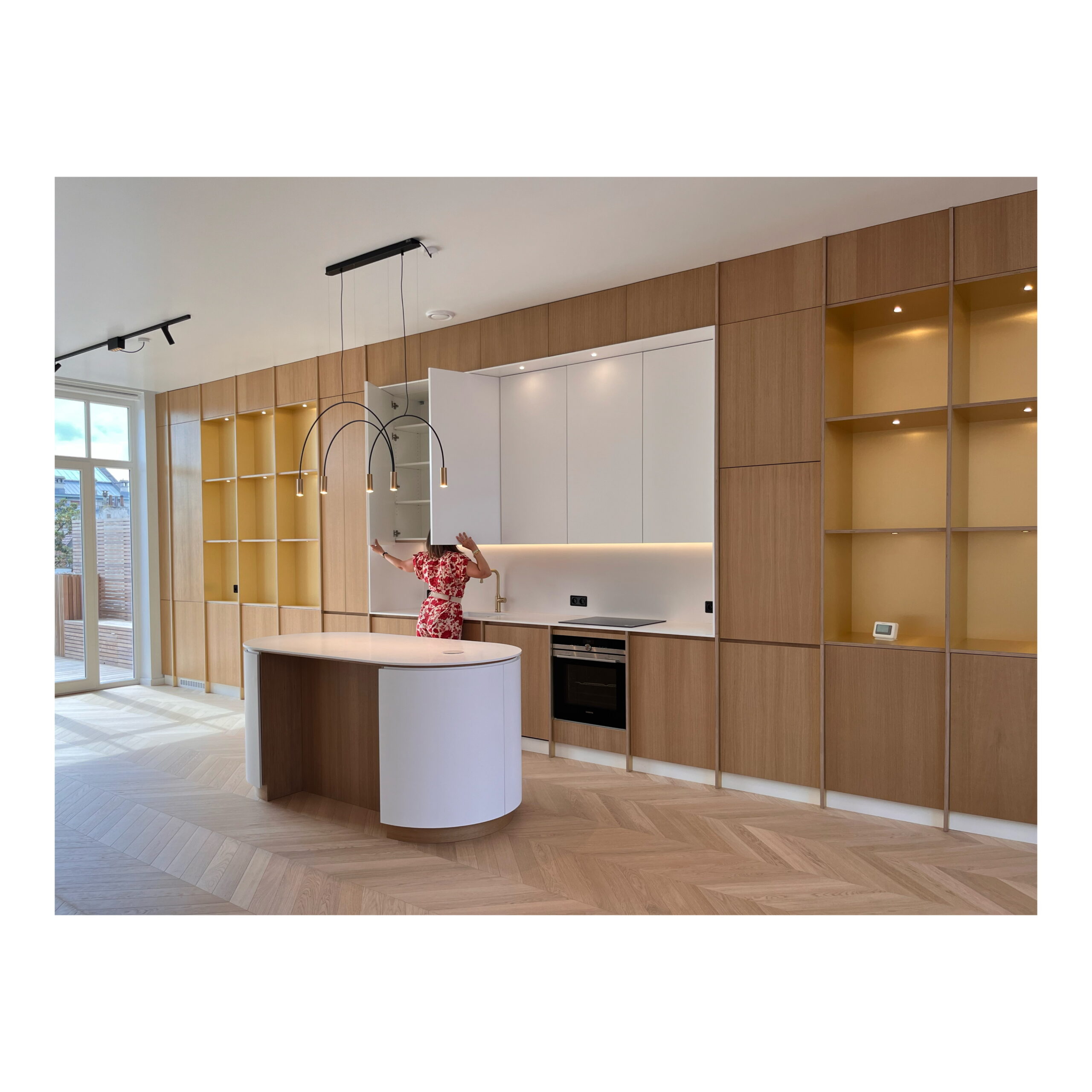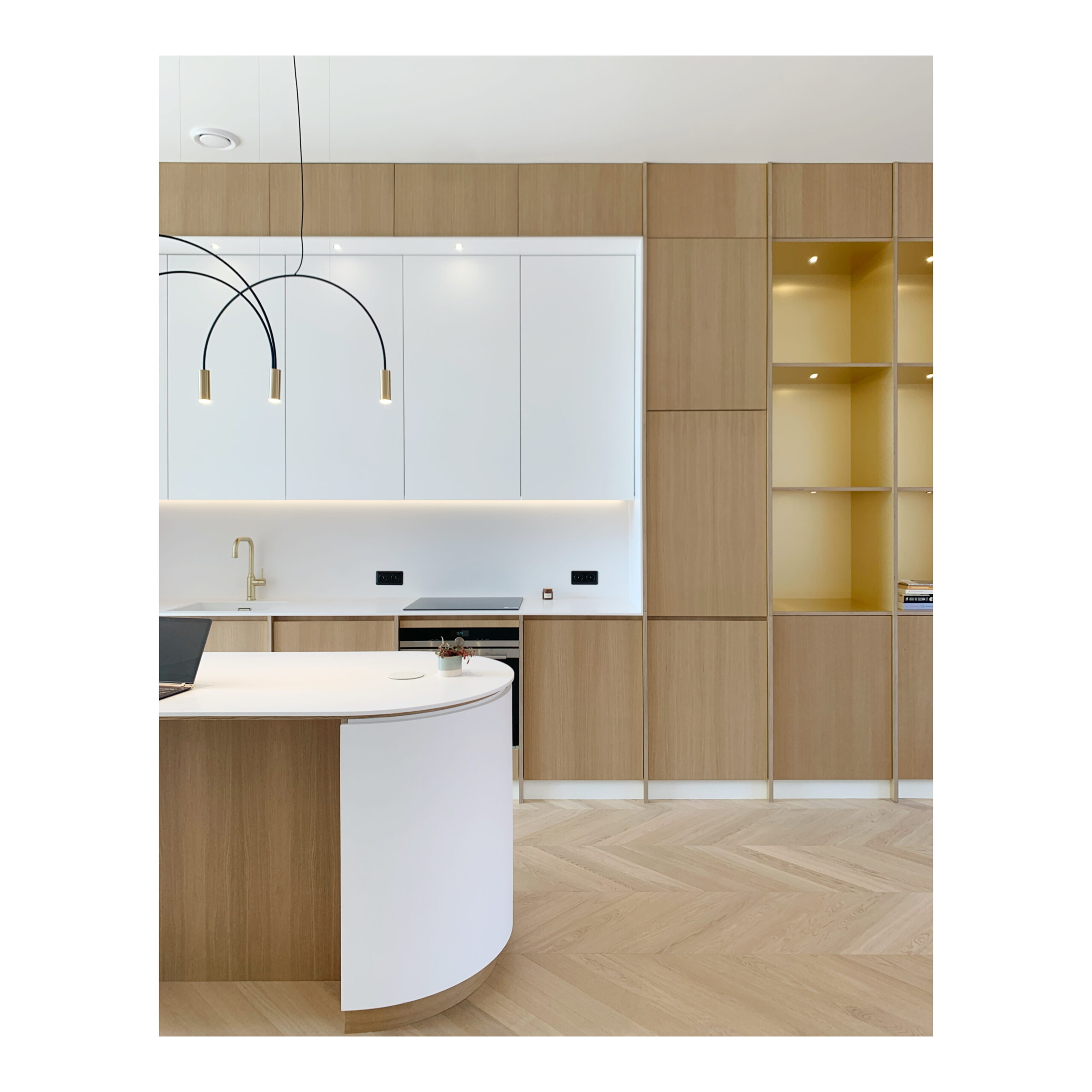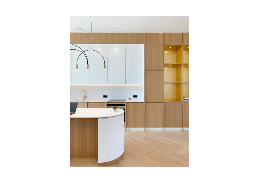 Les matériaux choisis; chêne , laiton brossé, carrelage blanc veiné; le sont pour leur douceur et leur faculté à réfléchir la lumière naturelle.