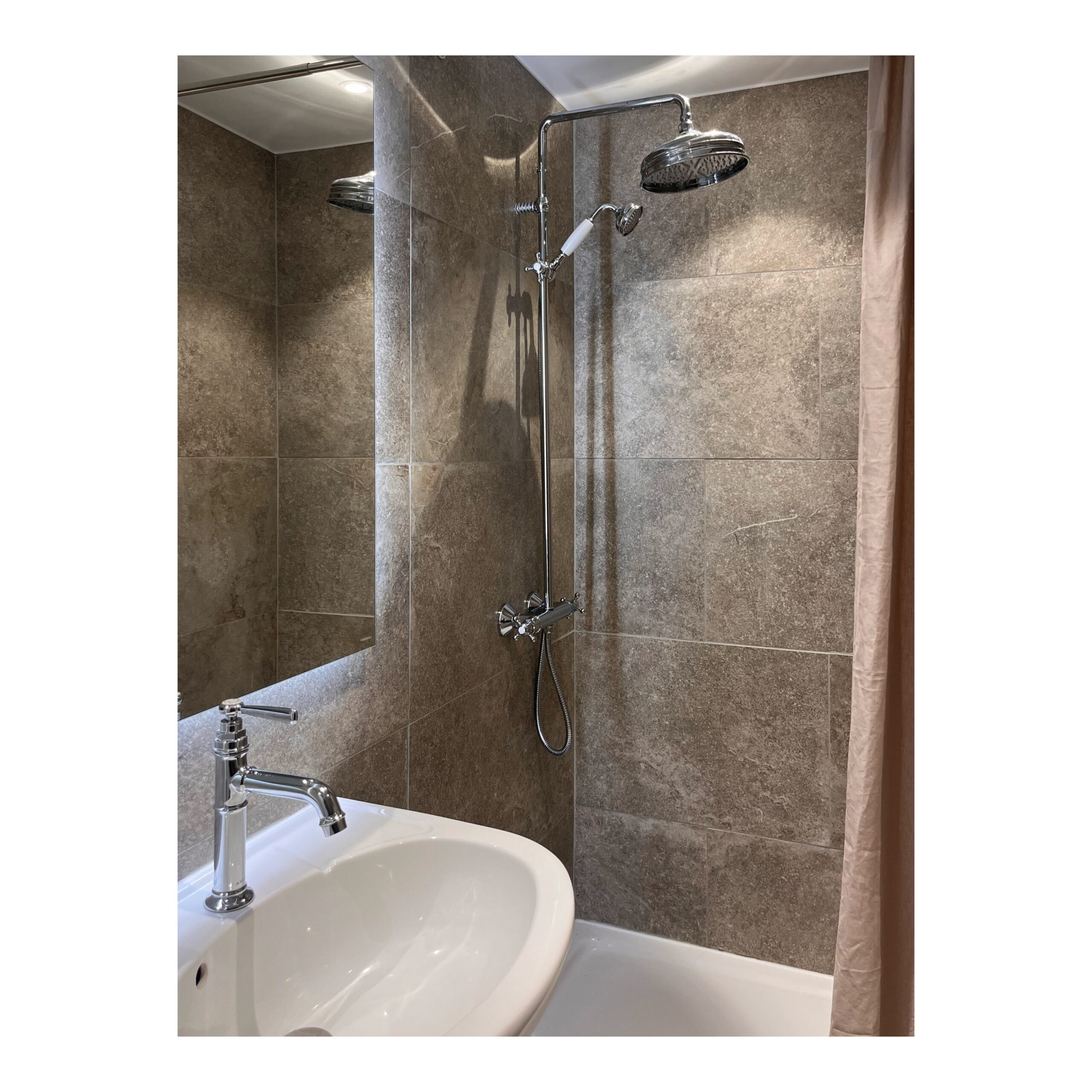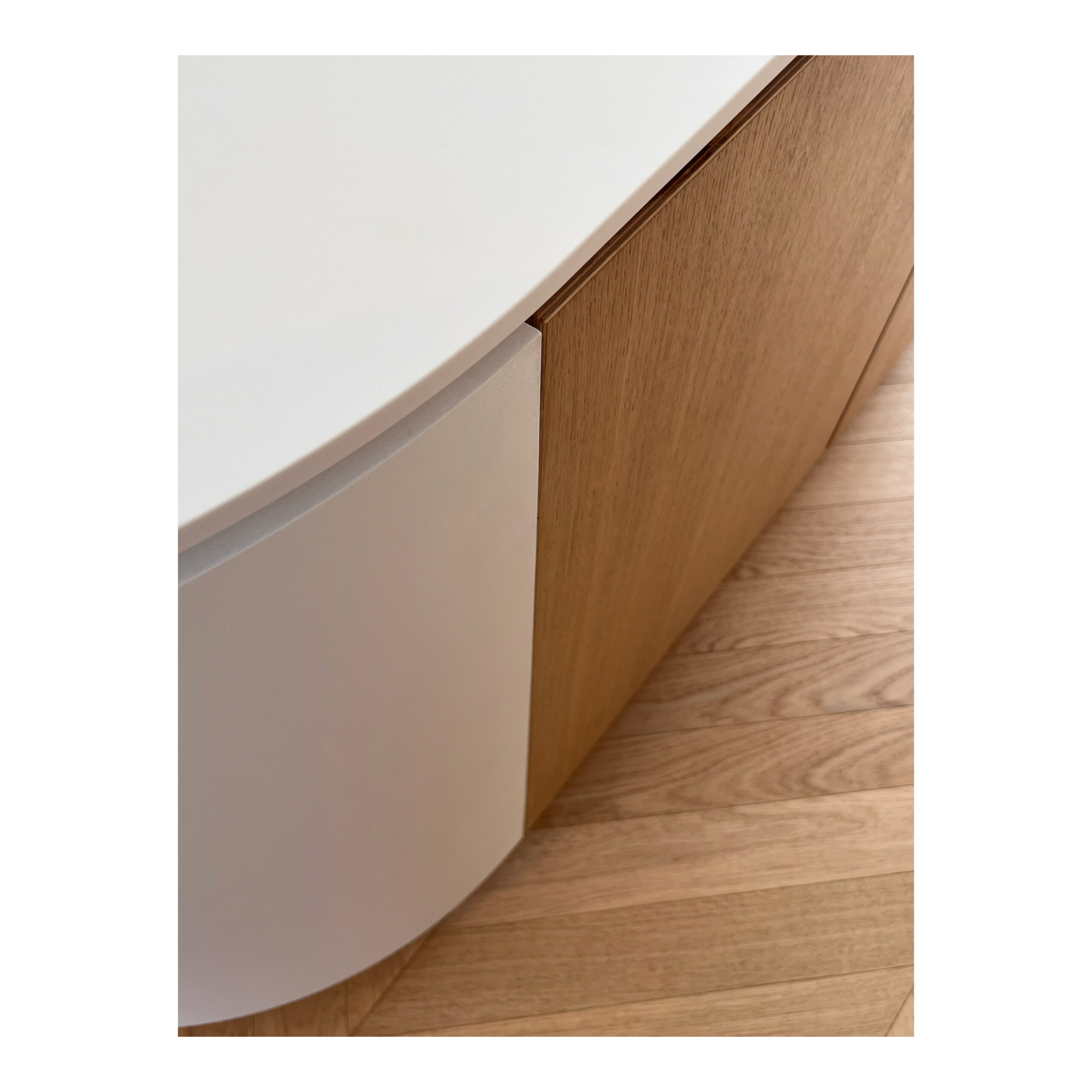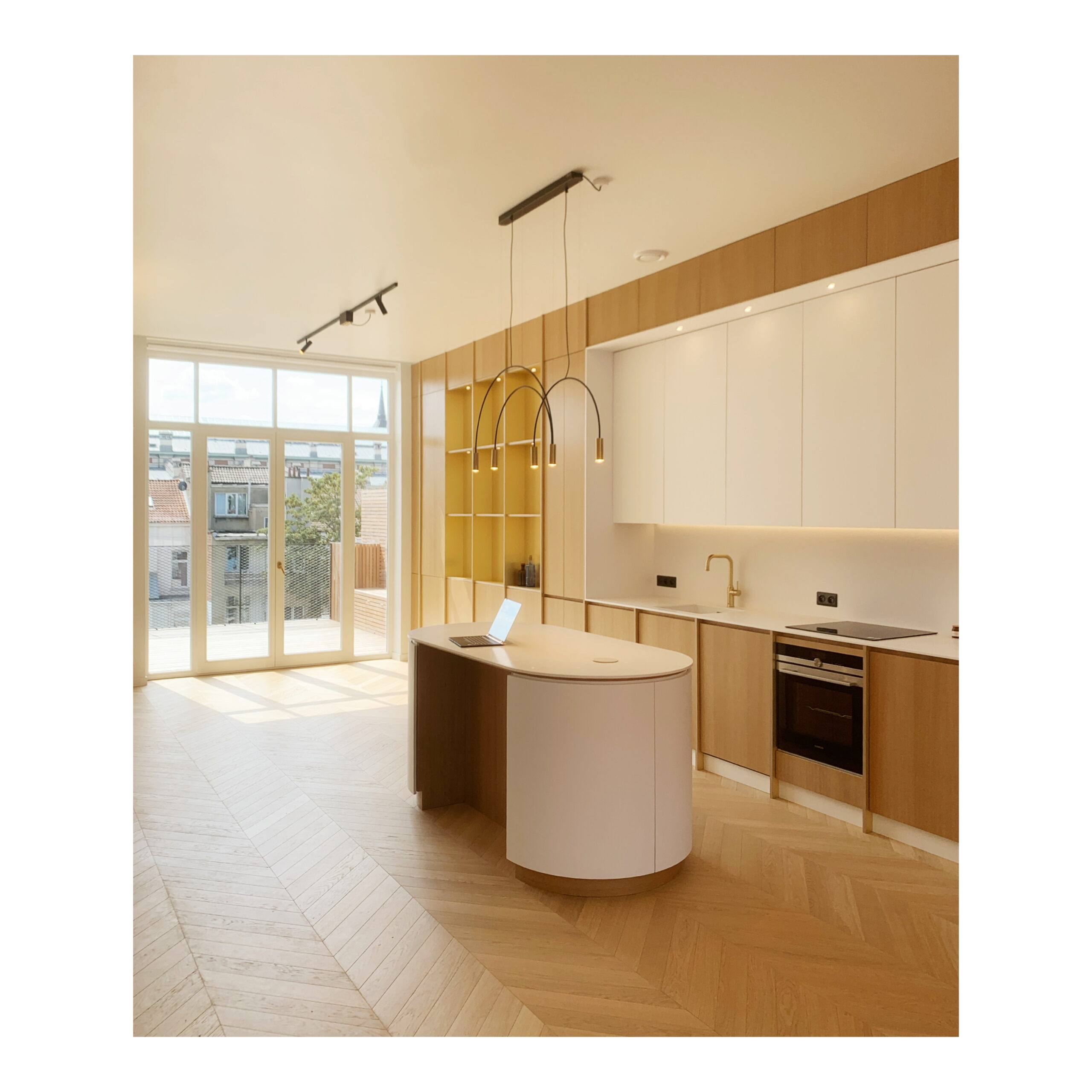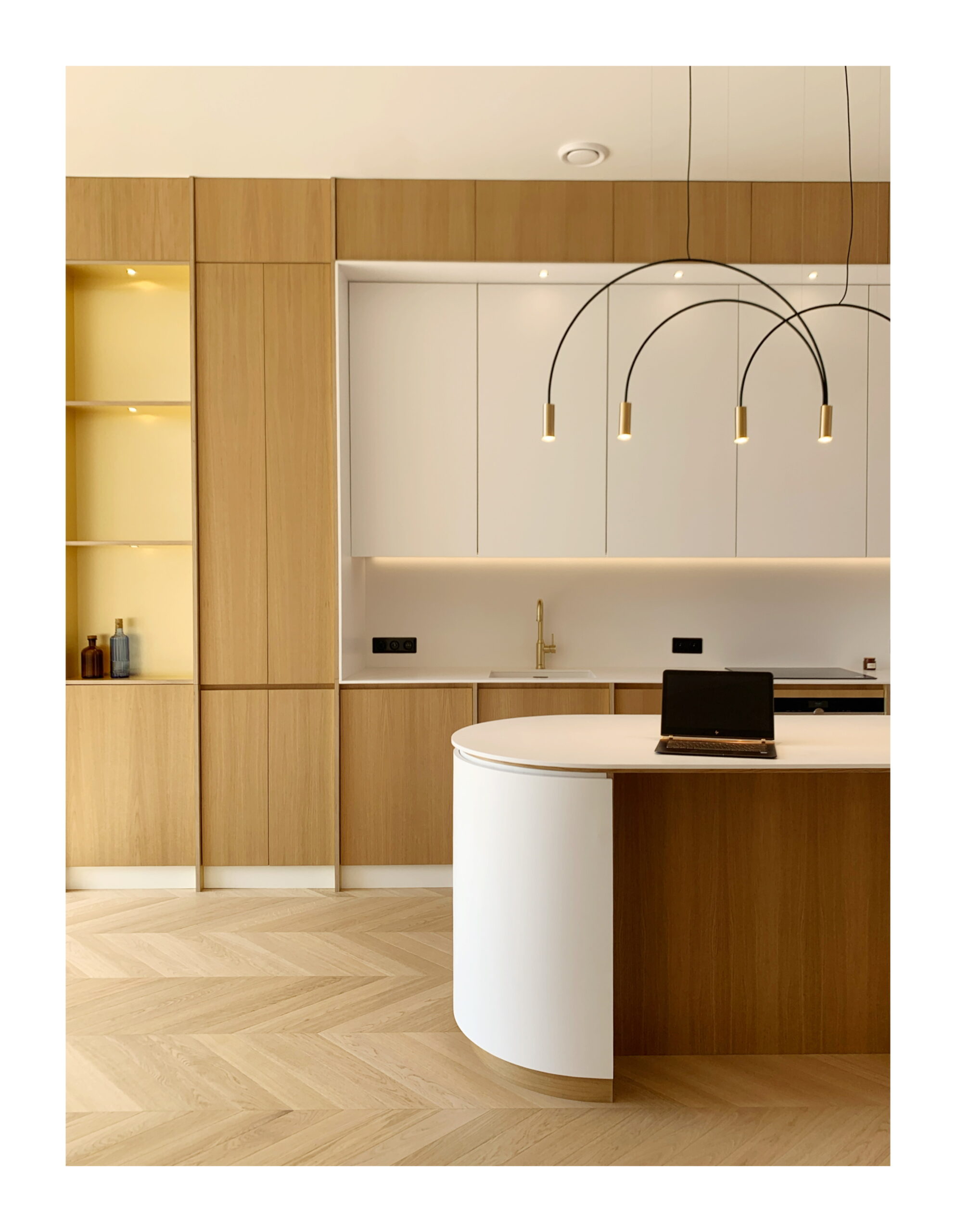 Les matériaux choisis; chêne , laiton brossé, carrelage blanc veiné; le sont pour leur douceur et leur faculté à réfléchir la lumière naturelle.