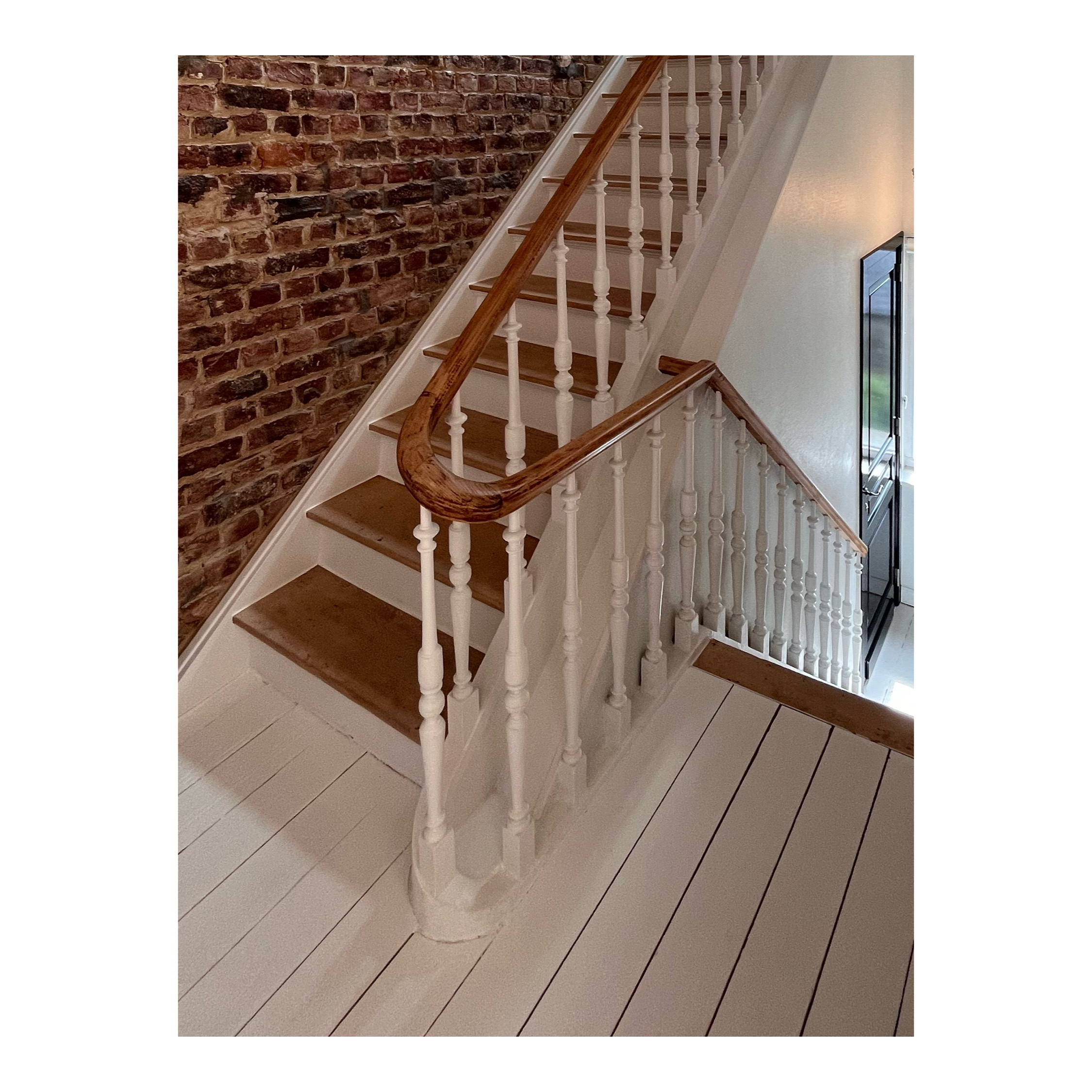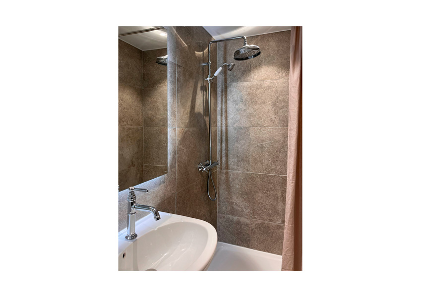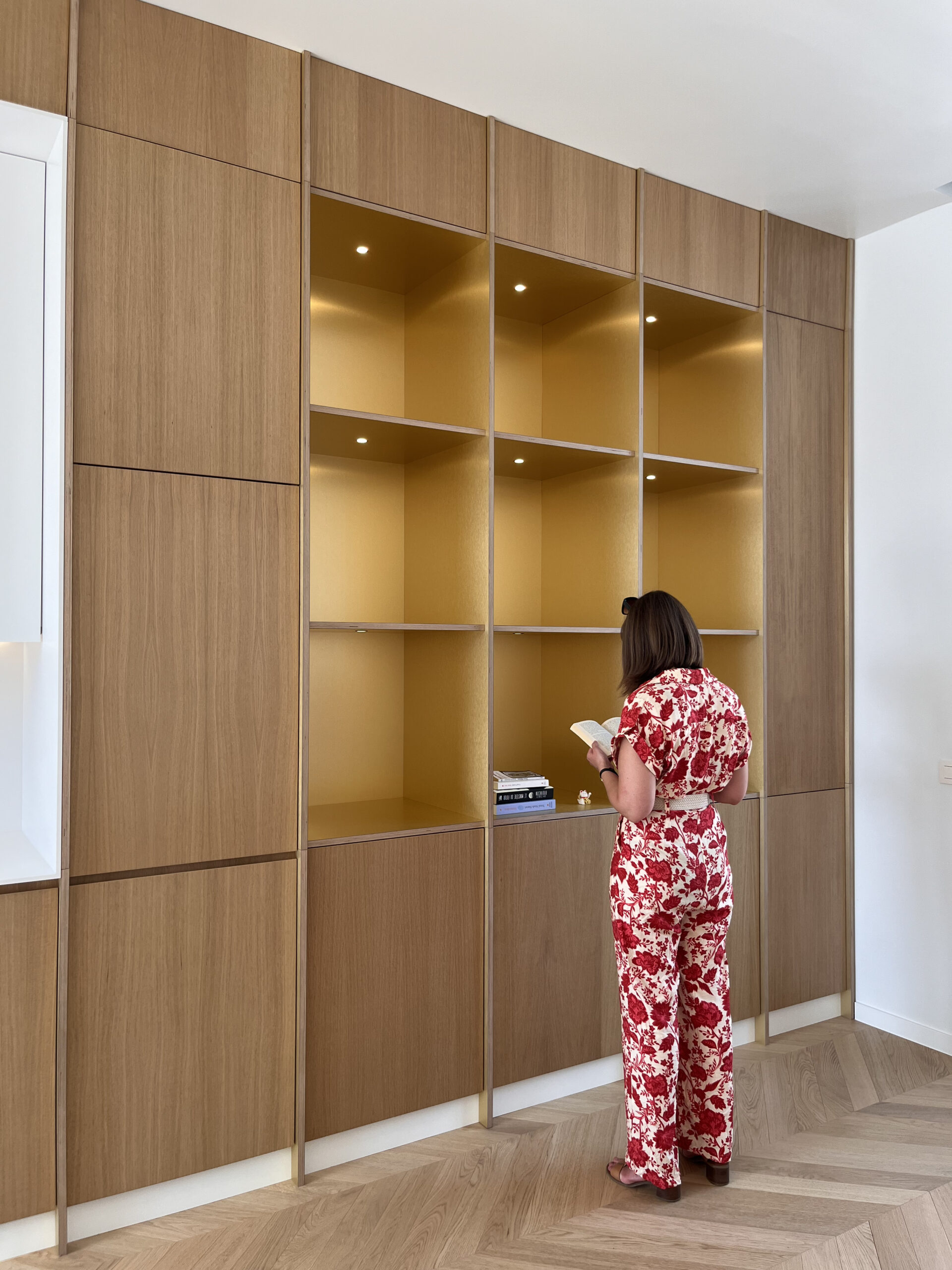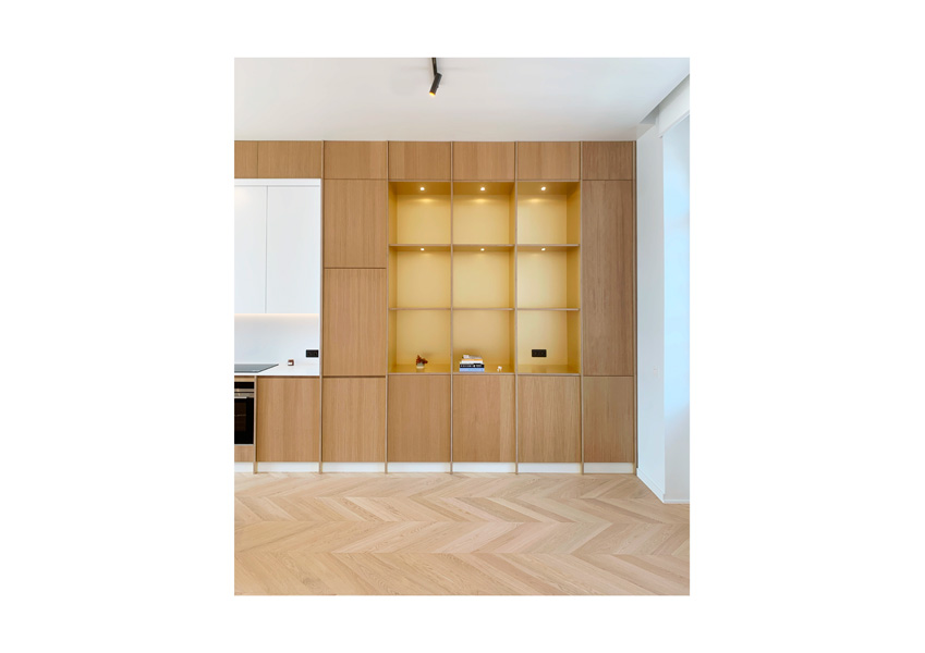 Dans cette optique d’ouverture et de libération d’espace, un grand meuble couvre toute la longueur du mitoyen et abrite la cuisine mais également les bibliothèques ainsi que des espaces plus techniques. Le plancher d’origine, bien que fort abîmé, a pu être repeint en blanc pour amener de la luminosité. Les salles d’eaux ont été réaménagés et les murs et plafonds peints de couleurs claires.