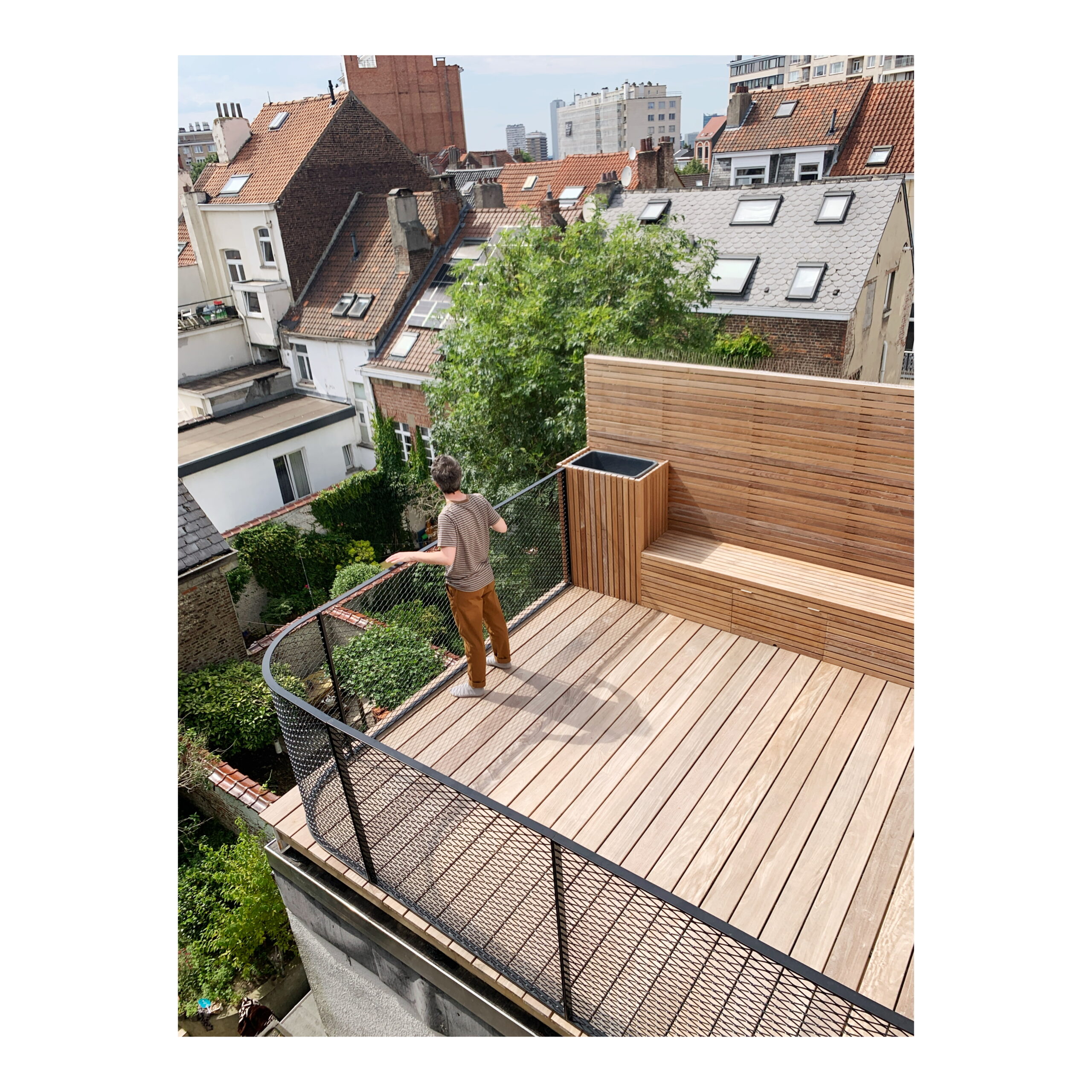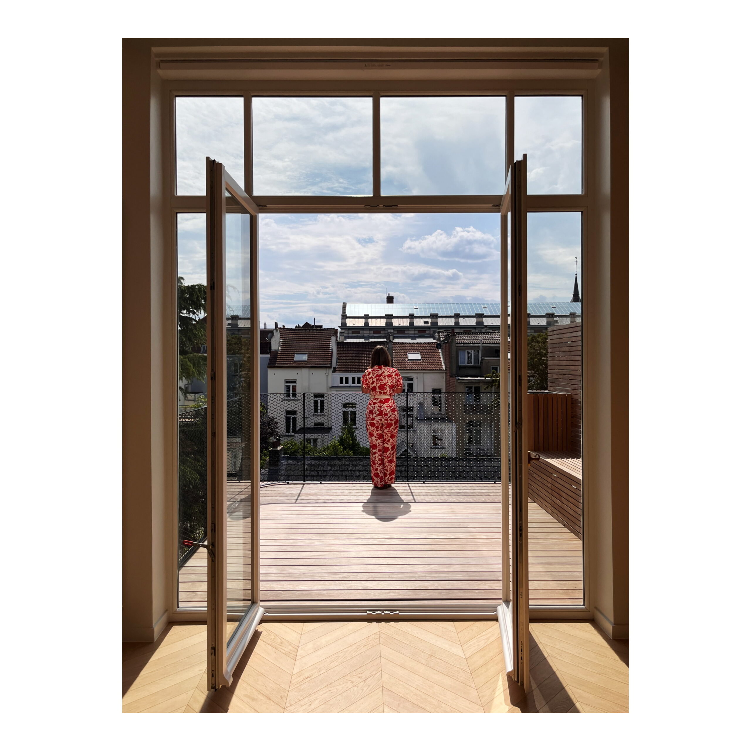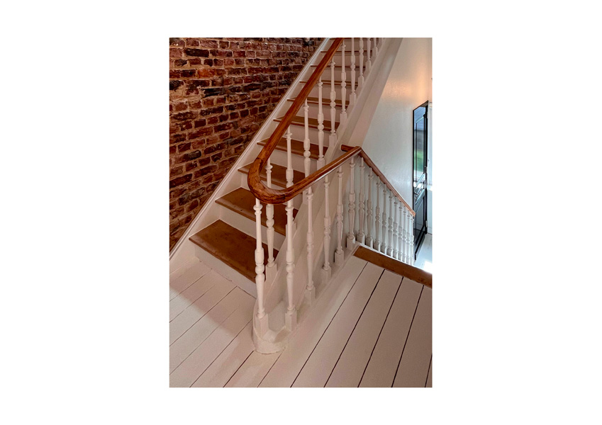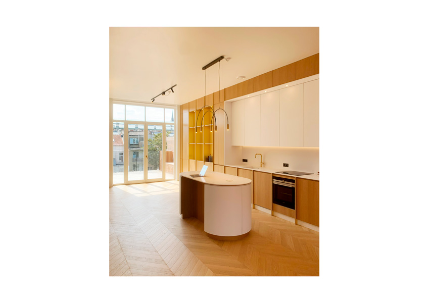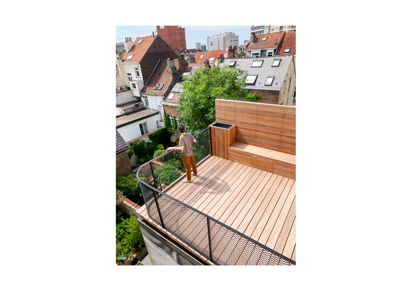 Les étages précédemment légèrement rénovés, l’espace de vie a, à présent, été entièrement ouvert et la baie vitrée arrière agrandie afin de profiter de la vue sur l’intérieur d’îlot.